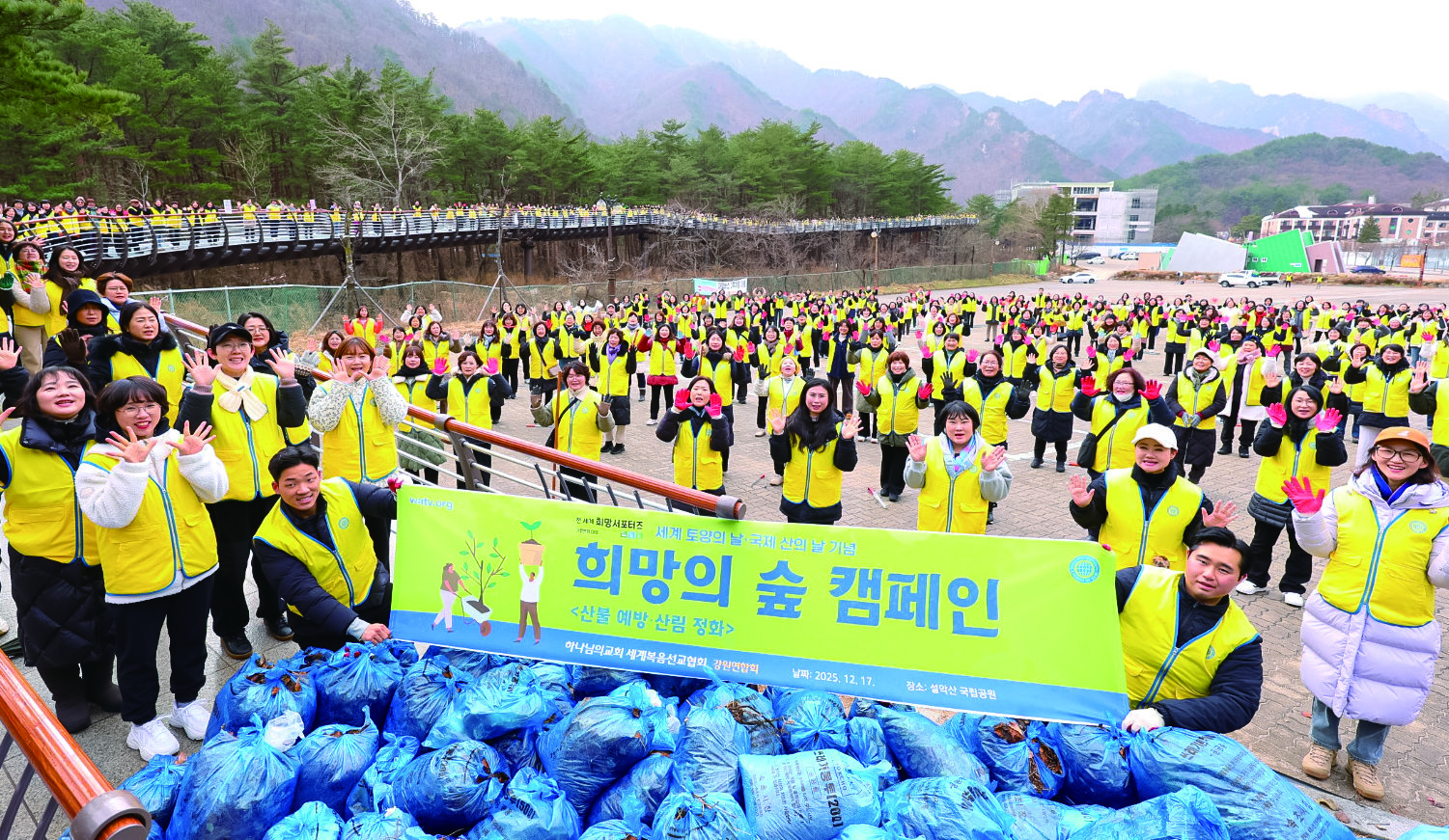 설악산 국립공원에서 ‘희망의 숲’ 캠페인을 펼치는 하나님의 교회 신자들. 쓰레기와 낙엽을 수거하며 훼손된 생태계를 복원했다.