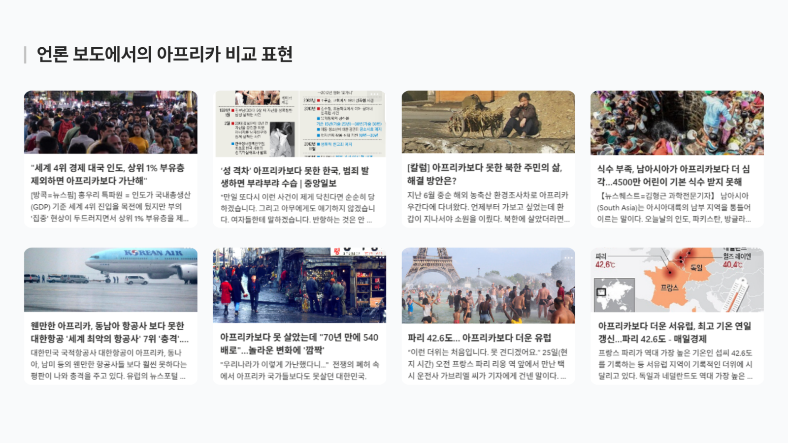 분석 결과, 언론 보도 영역에서는 아프리카를 부정적 상황의 기준점으로 설정하는 비교 표현이 반복적으로 사용되고 있는 것으로 나타났다. ‘아프리카보다 가난’, ‘아프리카보다 심각’, ‘아프리카보다 못한 환경’과 같은 표현이 국내외 언론 전반에서 유사한 구조로 확인됐다. 이러한 비교 구도는 단순한 정보 전달을 넘어 아프리카를 특정 이미지로 고정하는 인식 효과를 동반할 수 있다.