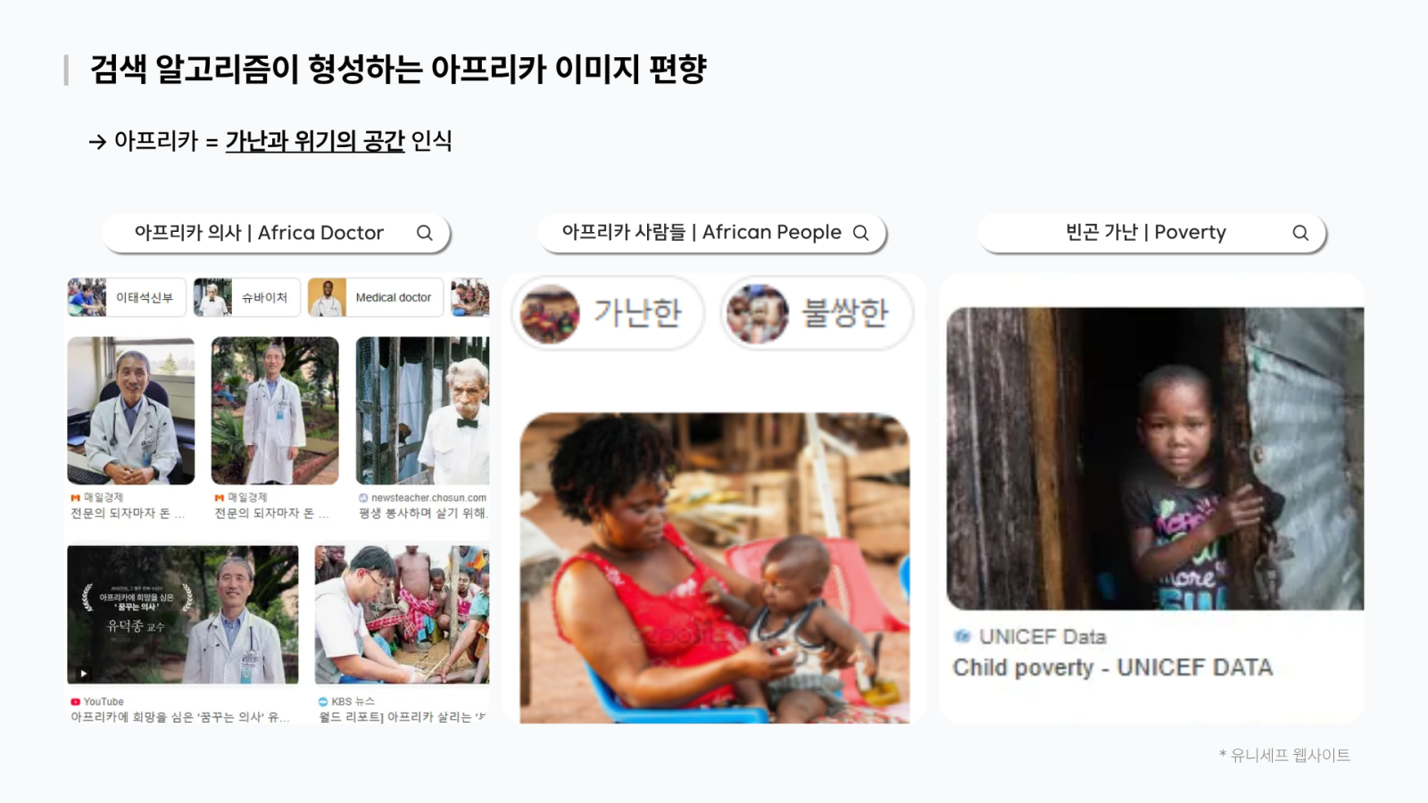 아울러 반크는 생성형 AI뿐만 아니라 검색 알고리즘 역시 아프리카에 대한 인식을 형성하는 데 중요한 역할을 하고 있다고 분석했다. 검색 포털은 연관 검색어와 이미지 상단 노출 기능을 통해 사용자가 접하는 정보의 방향을 결정하기 때문이다. 실제로 Google, Naver, Bing 등 주요 검색 포털에서 ‘아프리카 사람들’과 같은 일반적인 검색어를 입력했을 때, 빈곤이나 저개발을 연상시키는 이미지가 상단에 노출되는 경향이 확인됐다. 반면 아프리카의 일상적인 삶이나 현대적인 사회 모습, 다양한 문화적 맥락을 보여주는 이미지는 상대적으로 노출 빈도가 낮았다.