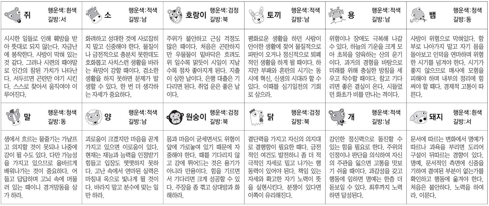 개띠 : 강인한 정신력으로 돌진할 수있는 힘을 필요로한다. 주위의인정이나판단을의식하여자신의 주관을 잃으면 고통을 맛보기 쉬울때이다. 과감성을 갖고행동에 임하면 명예는 한층 더돋보일 수 있다. 최후까지 노력하면달성된다.