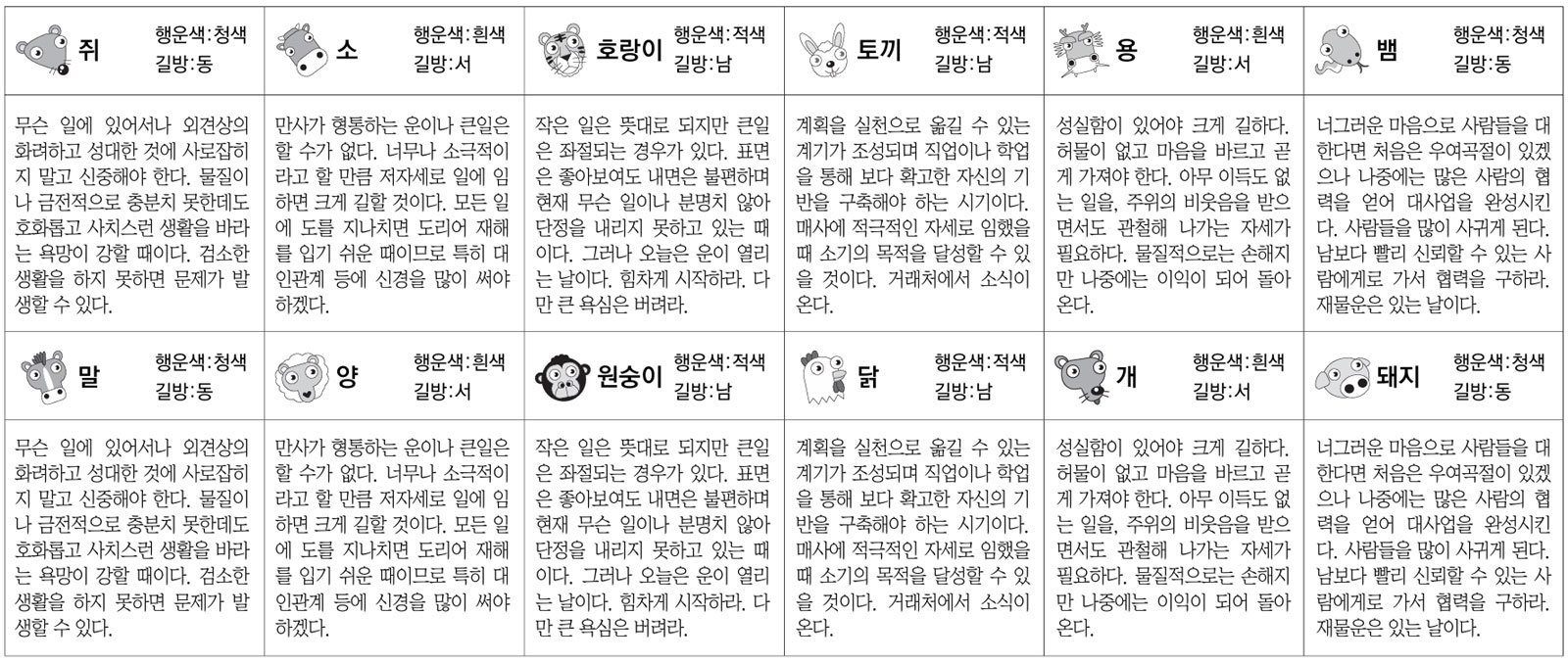 호랑이띠 : 작은 일은 뜻대로 되지만 큰일은 좌절되는 경우가있다. 표면은좋아보여도내면은불편하며현재 무슨 일이나 분명치 않아단정을 내리지 못하고 있는 때이다. 그러나 오늘은 운이 열리는날이다.힘차게시작하라.다만큰욕심은버려라.