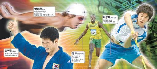 서로 마음이 잘 맞아 아주 친하게 지낼 때 흔히 ‘찰떡궁합’이라고 부른다. 인간관계에서 이런 궁합은 아주 중요한 요소로 여겨진다. ‘성격 차이’라는 것도 따지고 보면 이런 궁합 여부와도 관련이 있다. 스포츠에서도 마찬가지다. 분명히 궁합이 존재한다. 선수와 종목 간에 궁합이 잘 맞아야 성장도 하고, 나아가 세계 정상에도 설 수 있다. 물론 서로 어긋날 때는 선수 생명을 장담할 수 없다. 이번 주 ‘스포츠 & 사이언스’에서는 스포츠 선수와 종목의 상관관계를 알아본다. ■ 스포츠선수의 체형과 종목의 궁합 성공적인 베이징올림픽 이후 국민들의 관심은 스포츠 스타에게 쏠렸다. 대중들은 스포츠 스타의 얼굴이나 몸매를 보면서 감탄사를 연발한다. 메달리스트이기 때문에 멋있는 건지, 아니면 원래 선수 모습이 멋있는 건지는 알 수 없지만 금메달의 후광은 그만큼 대단한 것이다. 일반적으로 스포츠 선수들의 체형은 누가 봐도 멋있을 수 있지만 반면 그렇지 못한 스포츠 선수들도 있다. 또한 스포츠 종목별로도 각양각색이다. 그렇다면 종목별로 요구되는 체형이 따로 있는 것일까. 각 종목별로 궁합이 맞는 체형은 정해져 있는 것일까. 결론부터 말하면 ‘그렇다’이다. 종목에 따라 요구되는 신체조건이 있으며, 이에 따라 선수의 자질이 평가되기도 한다. 베이징올림픽 이후 가장 인기를 얻은 수영의 박태환을 보자. 작은 머리와 넓은 어깨, 긴 상지와 하지는 누가 봐도 호감을 느끼는 체형이다. 이런 체형이 수영선수들에게는 저항을 줄이고, 추진력을 증가시켜줄 수 있다. 또한 반복적인 움직임으로 만들어진 역삼각형의 상체는 수영선수들의 대표적인 체형이라 할 수 있다. ‘배드민턴의 영웅’ 이용대도 국민들의 사랑을 받는 대표적인 스타다. 이용대는 박태환에 비해 상체의 균형적인 발달은 덜 하지만 대퇴부를 중심으로 한 하체의 발달은 매우 뛰어나다. 아울러 경기 특성상 머리 위에서 라켓을 많이 휘두르며 진행되기 때문에 키가 크고, 팔이 긴 선수가 유리할 수 있는 특징이 있다. 일부에서는 왼손잡이 선수가 오른손잡이 보다 스매싱 각이 커져 공격에 더 유리하다고도 한다. 유도의 최민호는 큰 손과 괴력의 힘으로 잘 알려져 있다. 경기 특성상 지속적으로 도복을 잡고 경기를 해야 하기 때문에 유도 선수들의 손은 큰 편이고, 이에 따라 악력도 매우 강하다. 또한 발도 큰 편이고 뼈대도 두꺼우면서 주로 상체의 근육이 잘 발달되어 있는 것이 특징이다. 특히, 최근 유도선수들은 ‘몸짱’ 처럼 잘 발달된 잔 근육을 자랑한다. 흔히 종목별 선수들을 비교할 때 몸매가 가장 균형적으로 발달되었다고 평가받는 것은 육상 선수들이다. 베이징올림픽 육상 100m에서 우승한 우사인 볼트를 비롯한 단거리 선수들의 근육을 보면 조각처럼 매우 균형적으로 발달이 되어 있다. 그러나 이들의 발목은 매우 가늘다는 특징이 있으며, 반면에 어깨와 골반은 넓은 것이 공통적으로 나타나는 신체특성이다. 중장거리 선수들은 단거리 선수들에 비해 근육이 발달하기 보다는 심폐기능이 더욱 요구되기 때문에 주로 마르고 키가 작은 선수들이 대부분이다. 한국의 대표적인 마라토너 황영조와 이봉주 모두 170cm가 되지 않는 단신이다. 베이징에서 드라마 같은 경기를 펼친 복싱의 백종섭과 김정주를 떠올려보자. 복싱선수들의 가장 큰 특징은 체중조절 종목으로 인한 적은 체지방량이다. 실제로 복싱선수들을 보면 정말로 군살 없이 잔 근육들로만 체형이 이뤄져 있다. 이런 이유로 모든 스포츠 선수들 중에서 체력이 가장 좋다고 평가받는 것이 바로 복싱 선수들이다. 또한 긴팔과 다리는 복싱선수들에게 유리한 신체조건을 가져다준다. 이외에도 태권도 선수들의 체형은 허벅지와 종아리를 비롯한 하체의 발달이 주요한 특징이며, 경기 특성상 지속적으로 뻗어야 하기 때문에 키가 크고 다리가 긴 선수들이 유리하다. 또한 돌려차기 등 회전을 많이 하기 때문에 복부와 허리의 근력이 잘 발달되어 있다. 위에서 보듯 각 종목별로 적합한 체형이 존재하는 반면 선수들의 체형이 크게 중요시 되지 않는 종목도 있다. 대표적인 종목이 양궁과 사격이다. 물론 이들도 경기력 향상을 위해 체력운동을 하지만 다른 종목과 비교해 볼 때 체형 및 체력의 중요성보다는 심리적인 요인을 매우 중요시하기 때문에 선수들의 체형은 일반인들과 크게 다를 것이 없다. 결론적으로 종목별로 적합한 체형이 존재하며 이러한 체형이 선수들의 경기력에 영향을 미친다고 할 수 있다. 따라서 스포츠 선수가 되려는 어린 선수들은 자신들의 체력 특성과 성향 그리고 체형을 충분히 고려해 종목을 선택하는 것이 필요하다. 김광준 KISS 연구원 정리|최현길 기자 choihg2@donga.com
