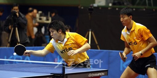 ´창과 방패의 대결´이 된 복식전, KT&G는 큰 키와 날렵한 움직임을 보인 오상은과 김정훈이 환상의 호흡을 자랑하며 1세트와 2세트를 각각 11-8, 11-4로 챙겼다.