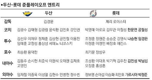 또 하나의 변수는 박종윤-이인구 두 좌타자를 빼고, 오장훈-최만호 우타자로 대체한 점. 두산의 좌투수 라인을 견제할 목적이다.