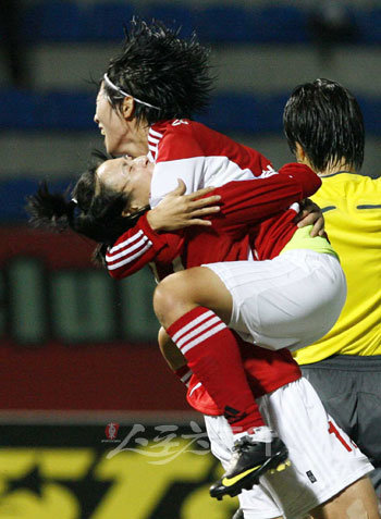 ‘내가 해냈어!’ 28일 열린 WK리그에서 현대제철의 김결실(왼쪽)이 결승골을 뽑아낸 뒤 동료 김주희를 끌어안고 기뻐하고 있다. 군산 | 임진환 기자 photolim@donga.com