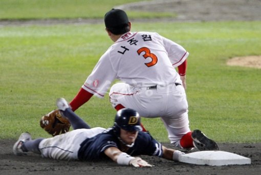 8일 인천 문학야구장에서 열린 2009 프로야구 플레이오프 2차전 SK와이번스 대 두산베어스의 경기. 8회초 2사 1루 두산 이종욱 타석 정수빈이 2루 도루에 성공하고 있다. 문학 | 양회성 기자 yohan@donga.com