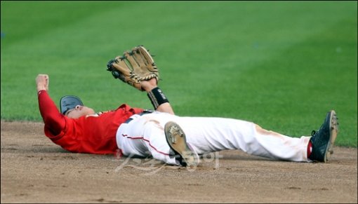 6회말 2사 후 두산 9번타자 용덕한이 SK 4번째 투수 이승호를 상대로 플레이오프 첫 안타를 때려냈다. 분위기가 심상치 않았다. 이어 타석에는 플레이오프 3할타율의 이종욱. 볼카운트 2-2에서 7구째를 강하게 받아쳤다. 총알 같은 타구는 2루를 꿰뚫고 중견수 쪽으로 빠질 듯한 기세였다. 그런데 정근우가 번개 같은 다이빙캐치로 타구를 걷어냈다. 그리고 순식간에 용수철처럼 일어서며 역동작으로 1루에 기막힌 송구를 해 아슬아슬아하게 아웃시켰다. 이종욱의 빠른 발을 감안하면 기적 같은 플레이. 이 호수비 하나로 양팀 덕아웃의 분위기는 상반됐다.