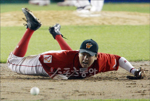 2009프로야구 한국시리즈 5차전 KIA타이거즈 대 SK와이번스의 경기가 22일 서울 잠실야구장에서 열렸다. 3회말 1사 KIA이현곤의 삼진아웃 때 2루를 훔치던 안치홍을 견제하다 SK2루수 나주환이 볼을 놓치고 있다.