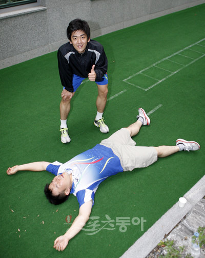 전영희(아래) 기자가 재활훈련 체험도중 지쳐 쓰러져 만세를 부르자 이용대가 옆으로 다가와 위로하다가 카메라를 향해 엄지손가락을 올려 보이고 있다. 스포츠에서 재활은 ‘사람을 키운다’라고 말할 정도로 부상을 입은 뒤 복귀를 준비하는 선수들에게는 가장 중요한 훈련이며 그만큼 힘들다. 용인 | 양회성 기자 yohan@donga.com