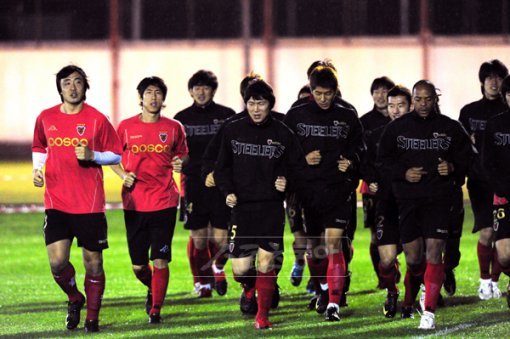 ‘훈련은 즐겁게’ 2009 FIFA 클럽월드컵에 출전 중인 포항 스틸러스가 16일 오전 1시(한국시간) 아부다비에서 아르헨티나 전통의 명문 에스투디안테스와 4강전을 치른다. 알 와다 아카데미 구장에서 훈련 중인 포항 선수들의 표정에 자신감이 엿보인다.사진제공 | 포항 스틸러스