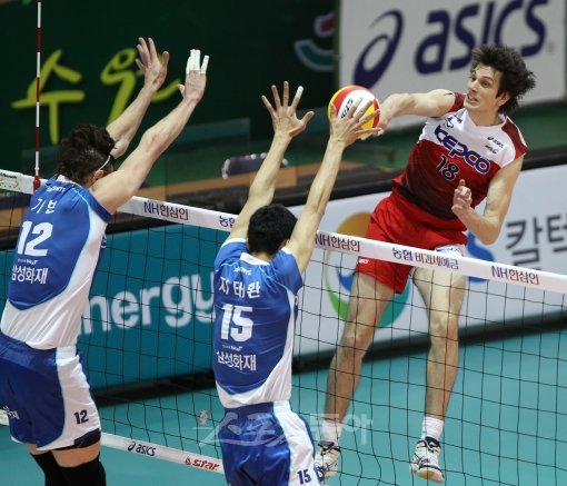 하지만 이번 시즌 삼성화재와의 두 번의 맞대결에서 완승을 거둔 KEPCO45도 쉽게 물러나지 않았다. 밀로스와 박준범의 공격이 살아나면서 10-5까지 앞서갔다. 분위기를 바꾼 것은 삼성화재의 가빈이었다. 10-6에서 잇단 서브 득점을 하며 10-8까지 따라붙었다. 이후 16-16까지 팽팽한 시소게임이었다.