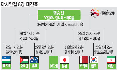 동아시아 최강 한국과 중동의 자존심 이란이 2011 카타르 아시안 컵 준결승 티켓을 놓고 겨룬다. 18일(이하 한국시간) 인도를 4-1로 완파했지만 아쉽게 골 득실에 밀려 C조 1위 자리를 호주에 내준 한국은 D조 1위를 확정지은 이란과 23일 도하 스포츠클럽 스타디움에서 8강전을 치른다.
