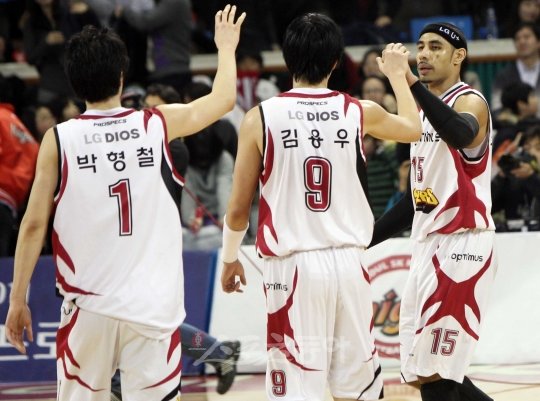 18일 서울 잠실학생체육관에서 열린 2010-11시즌 현대 모비스 프로농구 서울 SK와 창원 LG의 경기에서 LG가 89대 80으로 승리했다. 문태영이 동료들과 기쁨을 나누고 있다.