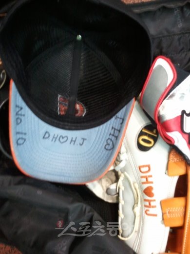 지퍼를 열어 놓은 롯데 한 선수의 가방 안입니다. 위로 향한 모자 안창과 그 옆에 자리 잡은 미트에 나란히 ‘DH♡HJ’라고 적혀 있네요.