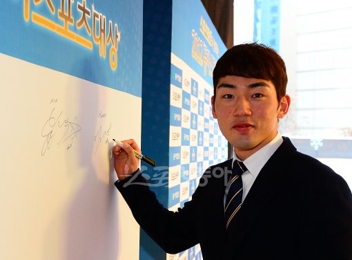 시상식에 참석한 프로야구 넥센의 서건창이 사인보드에 사인을 하고 있다.