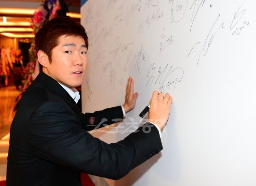 시상식에 참석한 프로야구 SK 박희수가 사인보드에 사인을 하고 있다.