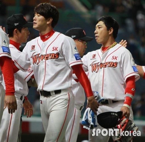 SK가 두산에 연이틀 짜릿한 승리를 거뒀다. SK는 5일 오후 인천 문학구장에서 열린 ‘2014프로야구’ 두산과의 경기에서 김강민의 7회에 터진 솔로홈런에 힙입어 4-2로 승리를 거두며 홈경기 4연승을 이어갔다. 7회말 솔로홈런을 치며 전날 끝내기 3루타에 이어 연이틀 결승타의 주인공이 된 김강민(오른쪽)이 이만수 감독의 환영을 받으며 덕아웃으로 향하고 있다.