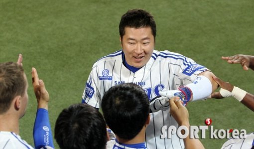 13일 오후 대구 시민구장에서 열린 ‘2014프로야구’ 삼성 라이온즈와 두산 베어스의 경기에서 삼성 4번 최형우가 7회말 선두타자로 나와 비거리 125미터 우월 솔로홈런을 치고 홈인한 뒤 동료들의 환영을 받고 있다.