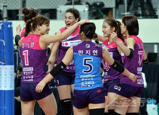 1일 오후 서울 장충체육관에서 열린 ‘2014-2015 NH농협 V리그 여자 프로배구’ GS칼텍스와 흥국생명의 경기에서 흥국생명 선수들이 득점 후 기뻐하고 있다. 장충|임민환 기자 minani84@donga.com 트위터 @minani84