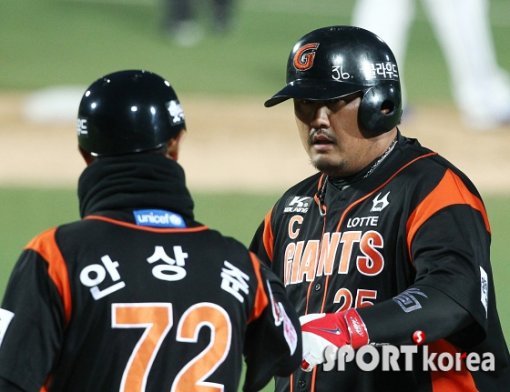 7일 오후 대구 시민야구장에서 열린 ‘2015 타이어뱅크 KBO 리그’ 삼성 라이온즈와 롯데 자이언츠의 경기 2회초 무사에서 롯데 최준석이 중전안타를 친 후 1루코치와 하이파이브를 하고 있다.
