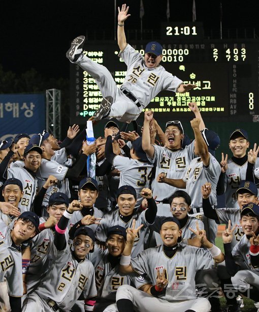선린인터넷고 윤석환 감독이 29일 목동구장에서 열린 제69회 황금사자기 전국고교야구대회 결승전에서 대구 상원고를 누르고 우승을 차지한 뒤 선수들의 헹가래를 받고 있다. 스포츠동아DB