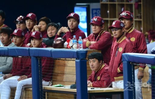 27일 서울 고척스카이돔에서 2016시즌 프로야구 시범경기 넥센 히어로즈와 NC 다이노스의 경기가 열렸다. 1회초 넥센 염경엽 감독을 비롯한 더그아웃의 코칭스테프와 선수들이 선발 박주현의 투구를 유심히 지켜보고 있다. 고척|김진환 기자 kwangshin00@donga.com