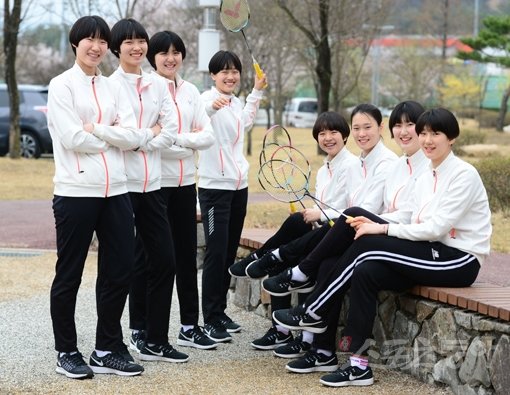 2016전국봄철종별배드민턴리그전에서 여고부 단체전 결승에 올라 정상을 노리는 울산범서고 선수들이 3일 잠시 짬을 내 활짝 웃으며 단체사진을 찍었다. 왼쪽부터 박민지, 김솜, 지정빈, 김성민, 박가은, 김가은, 백승희, 백승연. 김천|김민성 기자 marineboy@donga.com