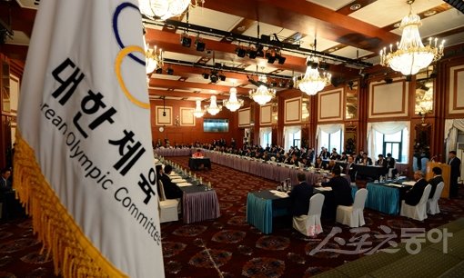 새로운 대한체육회 출범 이후 첫 임시대의원총회가 5일 서울 송파구 올림픽파크텔에서 열렸다. 이날 총회에선 새 정관 개정을 의결하는 등 4개 보고사항을 원안대로 처리해 통합체육회 출범 작업을 사실상 마무리했다. 김진환 기자 kwangshin@donga.com