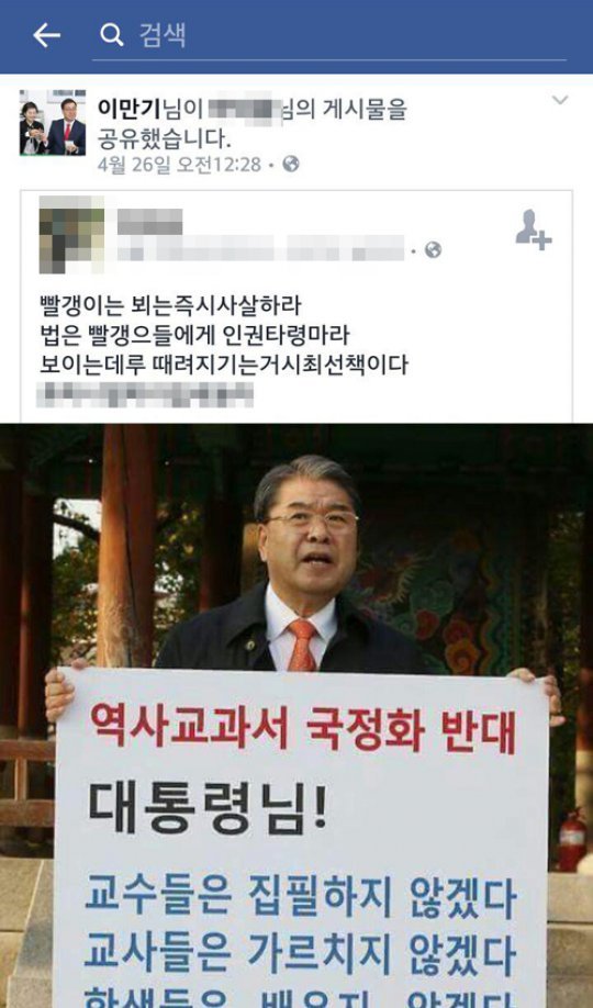 이만기는 지난 26일 오전 자신의 페이스북에 하 모씨의 글을 공유해 논란이 됐다. 이만기가 공유한 하 씨에 글에는 역사교과서 국정화에 반대하는 이재정 경기교육감의 사진과 함께 “빨갱이는 보이는 즉시 사살한다. 법은 빨갱이들에게 인권타령마라. 보이는대로 때려 지기는(죽이는) 것이 최선책이다. O마니 O따리 O쎄들아”는 내용의 다소 과한 표현의 글이 담겨있다.