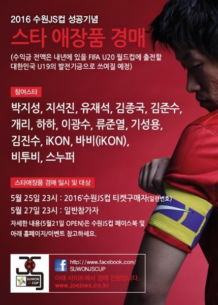 JS파운데이션은 18일 보도자료를 통해 "오는 18일 수원월드컵경기장에서 개막하는 ‘2016 수원 JS컵 U-19 국제 청소년 축구 대회’를 계기로 국민MC 유재석을 비롯한 국내 최고 스타들의 애장품 온라인 경매 이벤트를 진행한다"고 밝혔다.