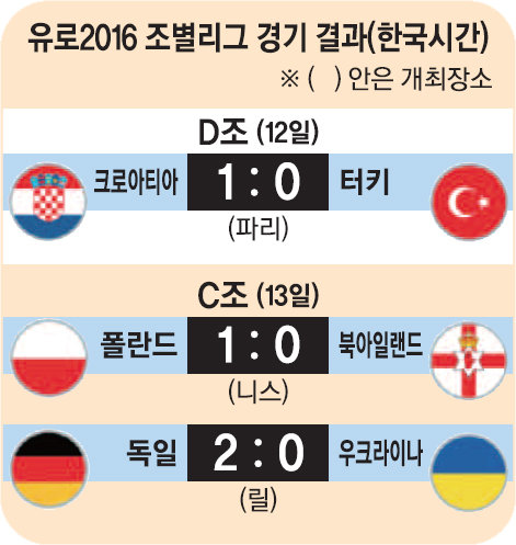 니스의 알리안츠 리비에라에서 펼쳐진 또 다른 C조 경기에선 폴란드가 아르카디우스 밀리크(아약스 암스테르담)의 결승골에 힘입어 북아일랜드를 1-0으로 제압하고 7번의 시도 끝에 사상 첫 본선 승리를 거뒀다. 북아일랜드는 A매치 12경기 무패행진에 제동이 걸렸다. 또 다른 우승후보 스페인이 속한 D조의 크로아티아는 12일 1차전에서 터키를 1-0으로 꺾었다. 전반 41분 루카 모드리치(레알 마드리드)가 중거리 발리 슈팅으로 귀중한 결승골을 만들어 크로아티아에 첫 승을 안겼다.