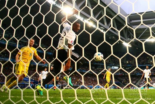독일 제롬 보아탱이 13일(한국시간) 프랑스 릴의 스타드 피에르 모루아에서 벌어진 우크라이나와의 유로2016 조별리그 C조 1차전 도중 골라인에서 오른발로 공을 걷어내며 상대의 득점을 저지하고 있다. 독일이 2-0으로 이겼다. 사진=ⓒGettyimages이매진스