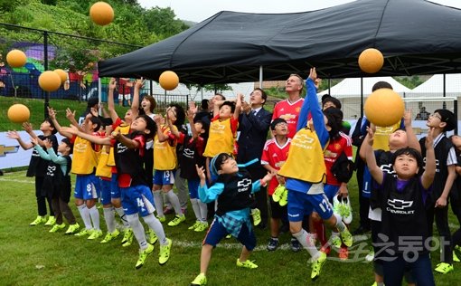 15일 쉐보레-초록우산 어린이재단 풋살경기장 기증식에 참석한 쉐보레 마케팅본부 이일섭 전무, 초록우산 어린이재단 이제훈 회장, 맨체스터 유나이티드의 레전드 게리 베일리 등이 풋살경기장 완공을 축하하고 있다.인천|김민성 기자 marine@donga.com