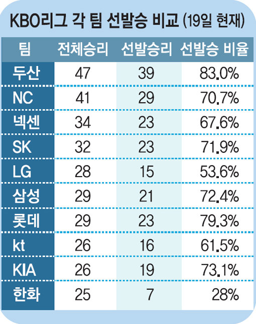 19일까지 두산이 거둔 47승 중 선발투수가 책임진 승리는 무려 39승. 1∼3선발인 더스틴 니퍼트와 마이클 보우덴, 장원준이 나란히 9승씩을 올리며 27승을 책임졌고, 여기에 4선발 유희관과 5선발 허준혁이 각각 7승과 3승을 더해 5명의 선발진이 총 37승을 도맡았다. 대체선발 고원준과 안규영의 깜짝 선발승을 합하면 39승에 달한다.