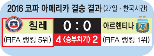 승부차기에 돌입했다. 선축한 칠레의 첫 번째 키커 아르투도 비달(바이에른 뮌헨)이 아르헨티나 골키퍼 세르히오 로메오(맨체스터 유나이티드)에게 막혔다. 아르헨티나의 첫 번째 키커는 메시. 성공할 경우 단숨에 분위기를 아르헨티나로 끌어올 수 있었다. 그러나 메시의 킥은 크로스바를 넘겼다. 메시는 당황스러운 표정을 감추지 못했다. 오히려 아르헨티나의 기세가 단숨에 꺾였고, 결국 지난 대회에 이어 이번에도 칠레가 우승컵을 차지했다. 칠레는 대회 2연패에 성공했다. 경기 후 메시는 “국가대표팀에서의 나는 끝났다. 내가 할 수 있는 모든 것을 했다. 우승하지 못해 마음이 아프다”며 국가대표 은퇴 의사를 드러냈다.