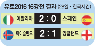 ‘축구종가’ 잉글랜드가 또 다시 메이저대회에서 실망만 안긴 채 탈락했다. 28일(한국시간) 프랑스 니스에서 열린 2016 유럽축구선수권대회(유로2016) 16강전에서 아이슬란드가 잉글랜드를 2-1로 꺾고 8강에 합류했다. 경기 직후 로이 호지슨 잉글랜드 감독은 사임을 선언했다. 아이슬란드는 개최국 프랑스와 다음달 4일 생드니에서 8강전을 치른다.