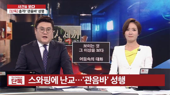 지난 12일 TV조선에 따르면 지난 2009년부터 생겨난 이들 관음바는 회원제로 은밀히 운영되는 한편, 난교에 스와핑까지 이뤄지고 있었다.