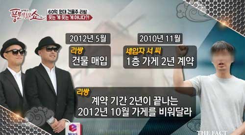 22일 밤 방송된 채널A '풍문으로 들었쇼'(이하 '풍문쇼')에서 최근 온라인을 뜨겁게 달군 힙합듀오 ‘리쌍’과 세입자의 분쟁 사건. 거액의 대출을 받아 건물을 구입한 리쌍과 그 건물의 세입자간