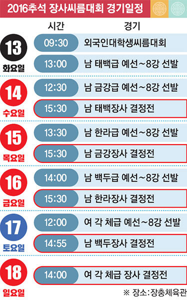 13일 남자 태백급(80kg 이하) 8강 선발전과 외국인대학생씨름대회 이벤트로 시작되는 이번 대회는 14일 남자 금강급(90kg 이하) 8강 선발전과 태백장사 결정전, 추석 당일인 15일 남자 한라급(110kg 이하) 8강 선발전과 금강장사 결정전, 16일 남자 백두급(150kg 이하) 8강 선발전과 한라장사 결정전이 잇달아 펼쳐진다. 17일에는 여자부 매화·국화·무궁화급의 예선 및 8강 선발전과 함께 체급별 장사씨름대회에서 가장 큰 인기를 누려온 백두장사 결정전이 벌어진다. 백두장사 패권은 장성복(양평군청), 손명호(의성군청), 이재혁(울산동구청)이 다툴 것으로 보인다. 18일 여자부 각 체급 결승전을 끝으로 마무리된다.