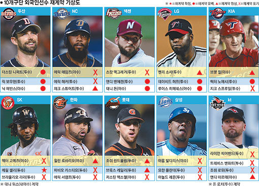 스포츠동아가 10개구단 관계자를 통해 외국인선수 재계약 여부와 새로운 외국인선수 계약 진척 상황을 점검해본 결과 올 시즌 활약했던 선수 중 예상보다 많은 선수들이 교체될 가능성이 있는 것으로 파악됐다. 특히 KBO리그를 지배한 특급선수들도 상당수 재계약하지 않는 선수로 분류되고 있어 주목된다.