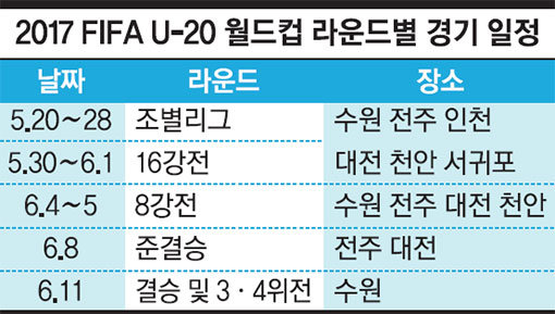 본선 24개국의 조 추첨식은 3월 15일 수원에서 열린다. 6개 도시에서 나눠 진행되는 이번 U-20 월드컵의 개막전은 5월 20일 전주에서 열리고, 6월 11일 예정된 3·4위전과 결승전은 수원에서 벌어진다.