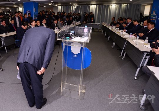 16일 서울 신문로 축구회관에서 열린 한국프로축구연맹 제11대 총재선거에선 단독 출마했던 신문선 후보가 낙선하면서 연맹의 취약한 재정 자립도와 구단간 불화 등의 문제점들이 수면 위로 떠올랐다. 투표에 앞서 정견 발표를 마친 신 후보가 대의원들에게 고개 숙여 인사하고 있다. 김진환 기자 kwangshin00@donga.com