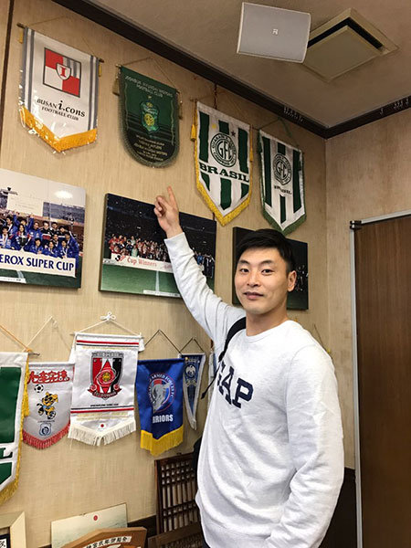 편안한 현실에 안주하는 대신, 스스로에 자극을 주기 위해 J리그 가시마 앤틀러스로 이적한 전북현대 출신 수문장 권순태가 새 소속 팀 클럽하우스를 둘러보다 전북 패넌트를 가리키며 환하게 웃고 있다. 사진제공 | HBR SPORTS
