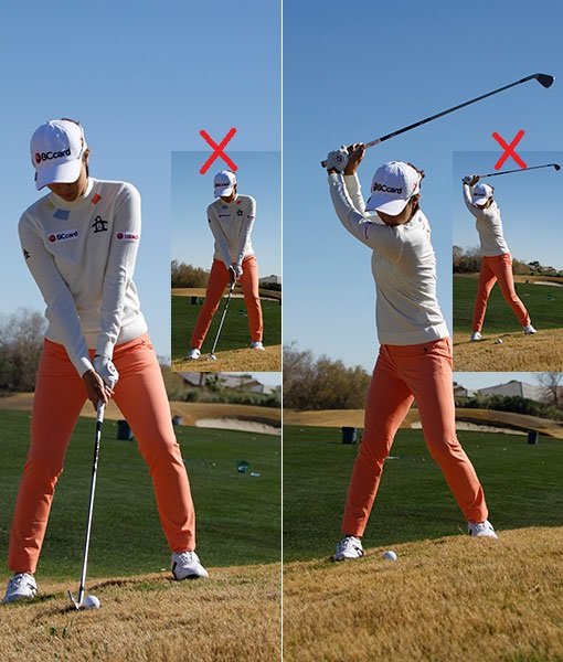 1. 어드레스 때 몸의 중심축이 지면과 직각을 이루고, 양 어깨를 잇는 선은 지면과 평행이 되도록 유지해야 한다. 2. 백스윙의 크기는 평소의 4분의 3 정도면 충분하다. 백스윙 때 체중이 왼발 쪽에 남아있으면 몸이 C자형으로 만들어지면서 ‘뒤땅’이나 토핑 같은 미스샷을 유발할 위험이 높아진다. 백스윙이 작아진 만큼 피니시 동작도 간결하게 마무리하는 것이 좋다.