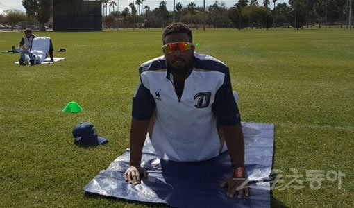 NC 새 외국인타자 재비어 스크럭스는 벌써부터 한국말을 하나둘 구사하며 적응에 박차를 가하는 모습이다. 친화력을 무기로 동료들과 하루빨리 어울리겠다는 자세가 인상적이다. 본격적인 훈련에 앞서 몸을 풀고 있는 스크럭스. 투산(미 애리조나주) | 고봉준 기자 shutout@donga.com