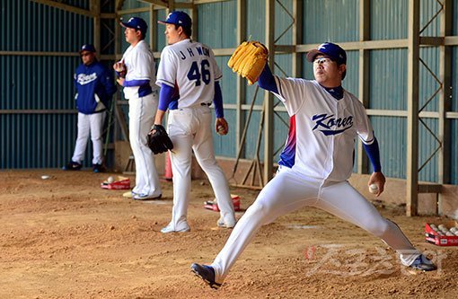 양현종의 불펜피칭을 끝까지 지켜본 선 투수코치는 “(양)현종이는 아직 몸을 만드는 과정”이라며 “팔이 완전히 넘어오지 않은 느낌”이라고 했다. 이날 빠른 공이 한두 차례 포수 김태군(NC)의 머리 위를 향한 이유도 여기에서 찾았다. 선 투수코치는 “일단 힘보다 밸런스에 신경을 쓰고 있다. (KIA 감독 시절에) 3년간 보니 현종이는 몸이 풀리는 페이스가 느린 편이다. 대회를 앞두고 컨디션이 올라올 것이다. 대회 전까지 100구 가까이 던져봐야 하지 않겠냐”고 밝혔다.