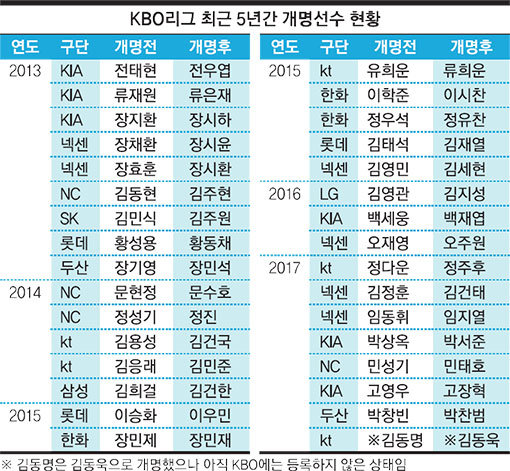 한화엔 자세히 보지 않으면 개명 사실을 알아차리기 힘든 선수들이 있다. 장민제는 장민재로 바꿨고, 심수창은 한글은 똑같지만 창(昶)을 창(昌)으로 바꿨다. 정재원(종전 정종민)과 장민석(종전 장기영)도 개명했다. LG 신승현은 SK 시절 김명완에서 개명했는데, 가정사로 인해 이름은 물론 성까지 바꿨다. 이밖에 LG에는 진해수(종전 진민호)와 김재율(종전 김남석), kt에는 장시환(종전 장효훈)과 윤요섭(종전 윤상균), 삼성에는 박근홍(종전 박정태), SK에는 전유수(종전 전승윤) 등이 개명한 대표적 선수들이다.