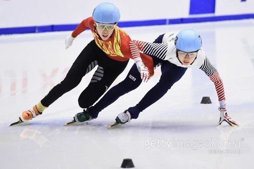 심석희(오른쪽)의 허벅지를 잡는 판 커신(왼쪽). ⓒGettyimages이매진스