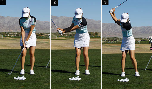 1. 왼 팔뚝과 클럽의 샤프트가 일직선을 이루면서 백스윙을 시작한다. 2. 클럽을 잡은 손이 허리 정도에 올라오면 자연스럽게 손목이 꺾이면서 코킹이 만들어진다. 그 전부터 일부러 손목을 꺾어서 스윙하면 클럽을 제어하는 능력이 떨어져 실수에 대한 대처가 늦어질 수 있다. 3. 스윙은 간결하고 작을수록 좋다. 하체를 지면에 단단히 고정한 상태에서 상체의 회전을 이용하면 간결하면서도 견고한 스윙을 만들 수 있다.