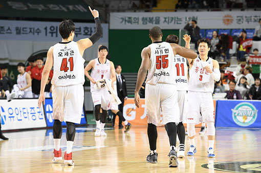 KGC는 동부의 무더기 3점슛에 고전을 면치 못했다. 3쿼터까지 12개의 3점슛을 허용하며 62-69로 끌려갔다. KGC는 4쿼터 중반부터 키퍼 사익스(25점·4어시스트)와 이정현(23점)을 앞세워 경기 흐름을 바꾸기 시작했다. 기습적인 트랩 수비로 동부의 실책을 유발한 데 이어 78-79로 뒤진 종료 2분35초 전 이정현의 3점슛으로 역전에 성공했다. 86-83으로 앞선 종료 23초 전에는 이정현이 상대 패스를 가로채 속공득점으로 연결한 덕에 승부에 쐐기를 박을 수 있었다. KGC에선 이정현과 사익스 외에도 오세근이 19점·11리바운드·5어시스트, 데이비드 사이먼이 21점·7블록슛으로 고르게 활약했다. 아킬레스건 부상으로 개막 이후 줄곧 결장해온 KGC 강병현은 3분4초를 뛰며 가볍게 복귀전을 치렀다. 동부는 13개의 3점슛을 폭발시키고도 4쿼터에만 턴오버 6개를 남발하며 자멸했다.